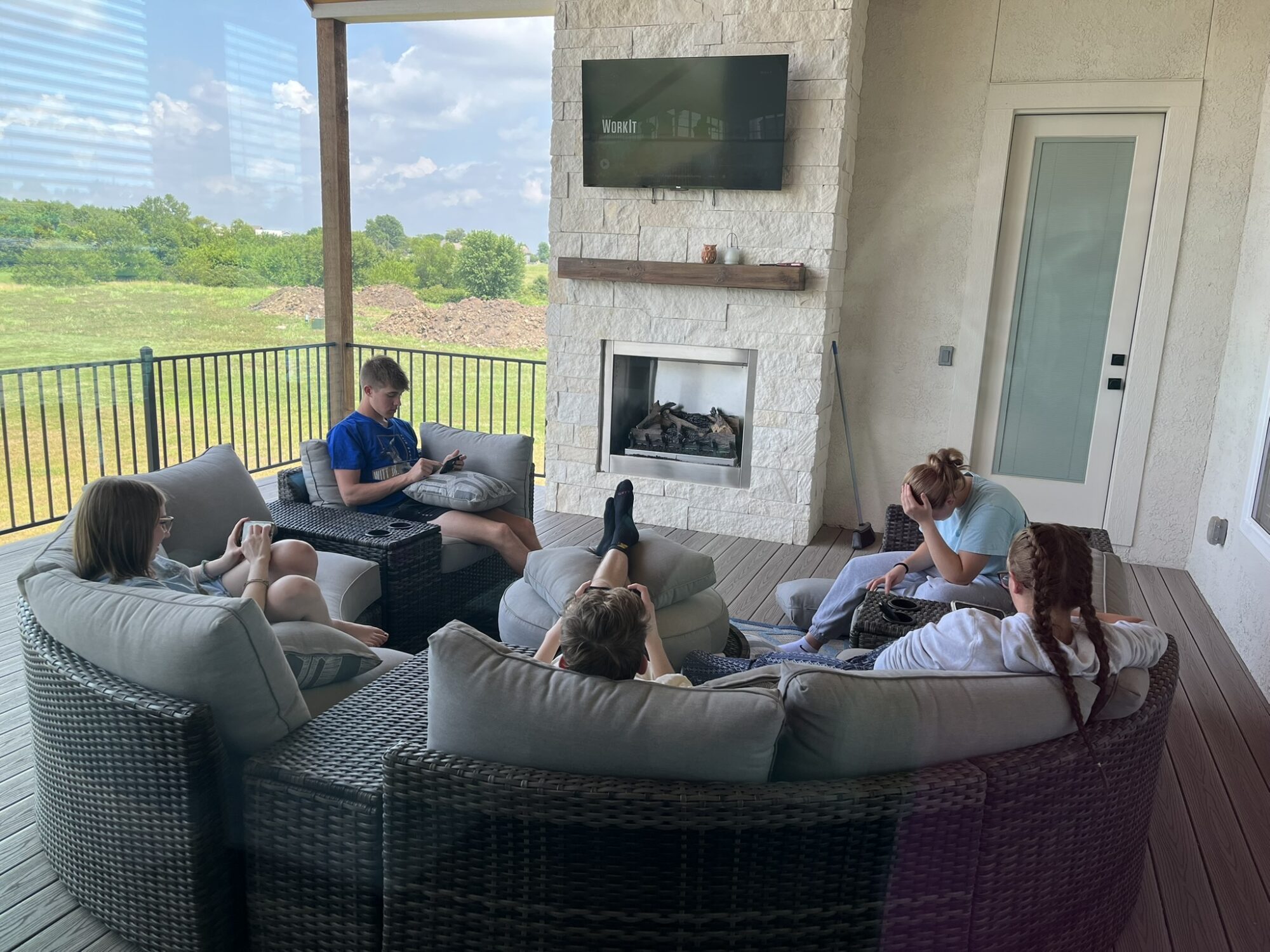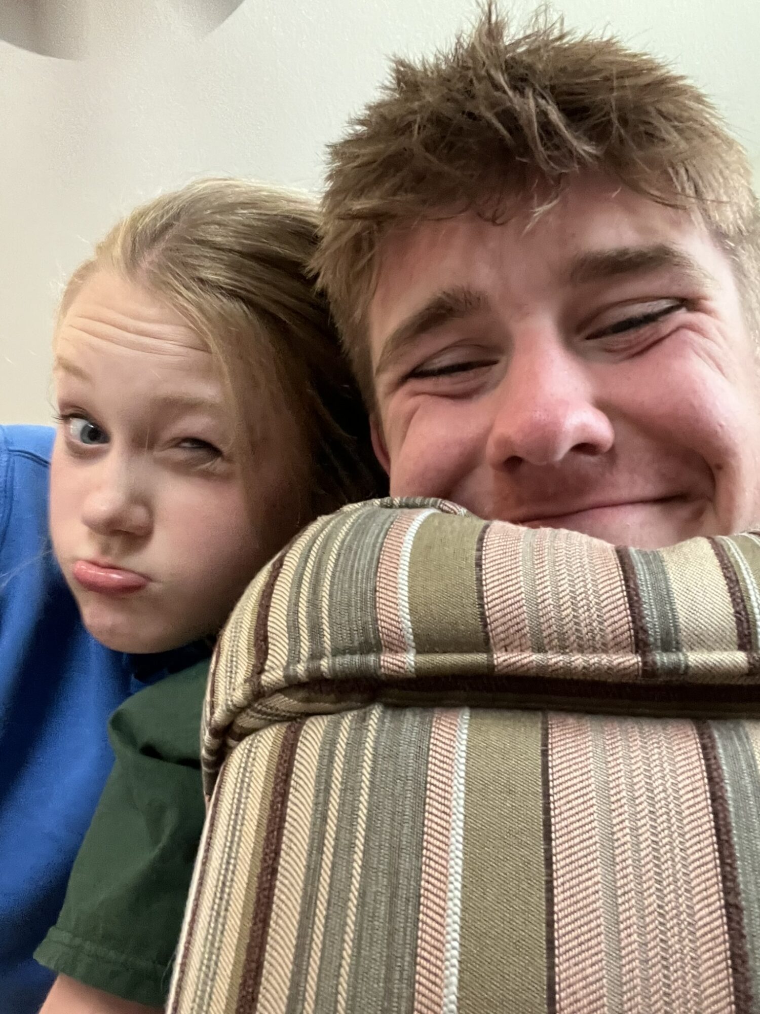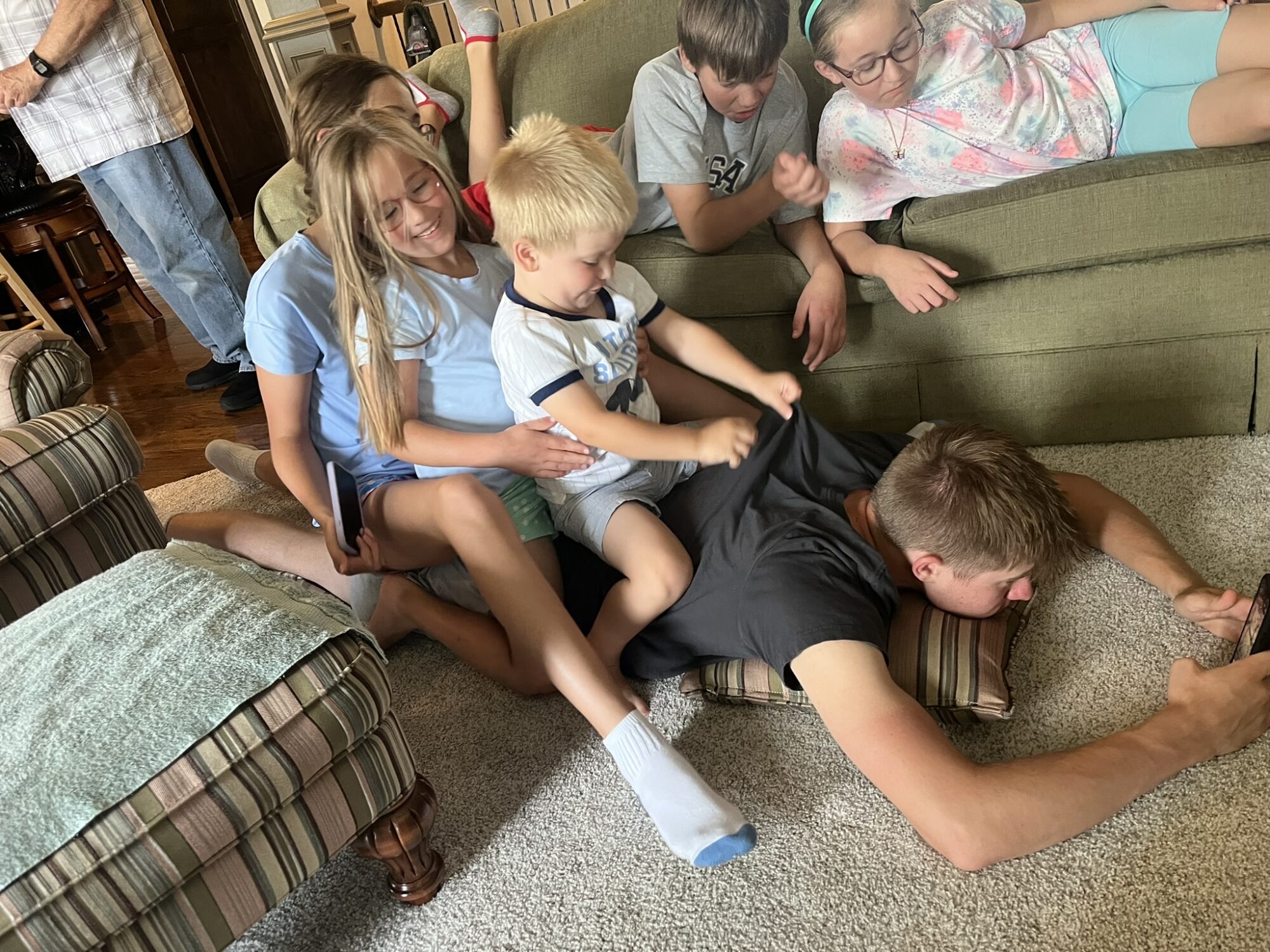 The older cousins found a place to hide from the younger ones for a bit and play a game against each other on their phones.